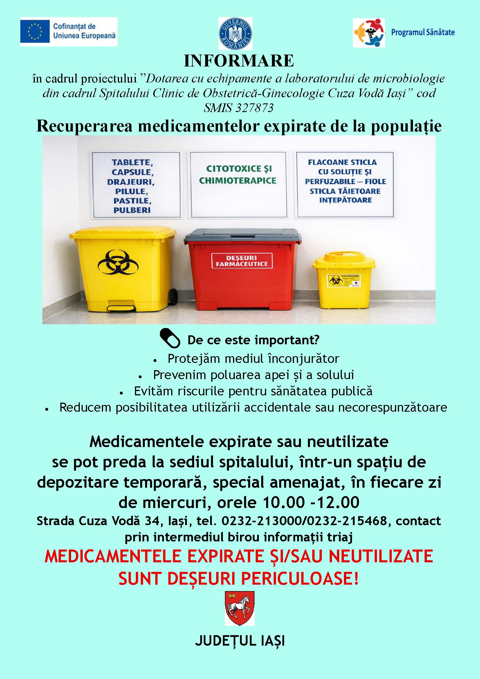 FEEDBACK PACIENT![]() Pentru intrebari si sesizari: contact@spitalcuzavodaiasi.ro Program preluare medicamente expirate de la populație- Miercuri: 10:00-12:00 |